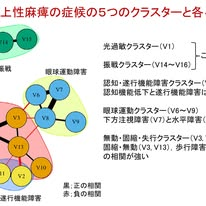著者らはMDS-PSP基準でprobable PSP-RSと診断した118例を対象に,認められた各症候の関連を可視化したネットワーク解析と,患者群を分類するクラスター解析を行い,PSP-RSが均質な集団かどうかを検証しました.その結果,まず16種類の症状は5つのクラスター(①光過敏,②認知・遂行機能障害,③振戦,④眼球運動障害,⑤無動・固縮・失行)に分類されました.興味深いのは,無動・固縮が強い患者ほど眼球運動は比較的保たれる一方で(図の赤い線=負の相関),認知機能障害とは負の相関を示しました.つまり無動・失行が重いほど認知機能が悪いということです.また,光過敏や振戦は他の症状と関連せず独立して存在し,眼球運動障害群では垂直方向の運動障害と水平方向の運動障害が密接に結びついていました.以上の結果から,PSP-RSの症候は無秩序の組み合わせで出現するのではなく,特定の組み合わせで出現するということが分かりました.