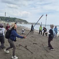 今日は、駒沢のwalking hut 2とチャッキ~の池上グループの16名が東京から遥々鎌倉ポール歩きにお出掛けくださいました。朝10時から夕方4時までのロングウォークになりました。観光客の少ない大町から材木座の寺院~材木座海岸~由比ヶ浜~扇が谷を歩き、小町通りで解散となりましたが 道中の絶え間のないお喋りオーラルトレーニングには参りました😙😗 目の前に拡がる波がキラリと光る砂浜でポールでゲーム三昧は身体中が若返り気持ちが躍りました。