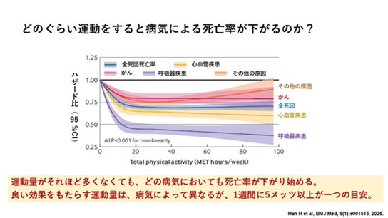 「運動が健康に良い」ということは誰もが理解していることですが、では病気の予防に良いのはどのぐらいの運動量なのかとか、どの病気でも適度な運動量は同じなのか、とかについては、これまであまり良くわかっていませんでした。