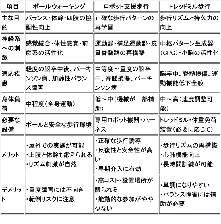 A6:いい視点だね!🍄 ポールウォーキング、ロボット支援歩行、トレッドミル歩行――どれも「歩く力」を取り戻すための手段だけど、それぞれ刺激する神経系の部位や訓練の目的、適応する疾患や段階が少しずつ違うんだ。まるで、同じ森でも登山道・小道・川沿いの道で見える景色が違うようにね。
